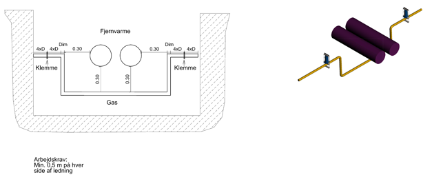 Ved omlægning af en stikledning ø20/25 ved krydsning med et fjernvarmerør skal der minimum være gravet 50 cm fri vandret på begge sider af fjernvarmerøret og på begge sider af gasrøret, samt 30 cm under fjernvarmerøret (hvis omlægningen skal laves under og ikke over fjernvarmerøret). - Udgravning til omlægning af større rør end ø25 kan bestemmes ud fra nedenstående tegningsmodel af en omlægning af gasledningen.